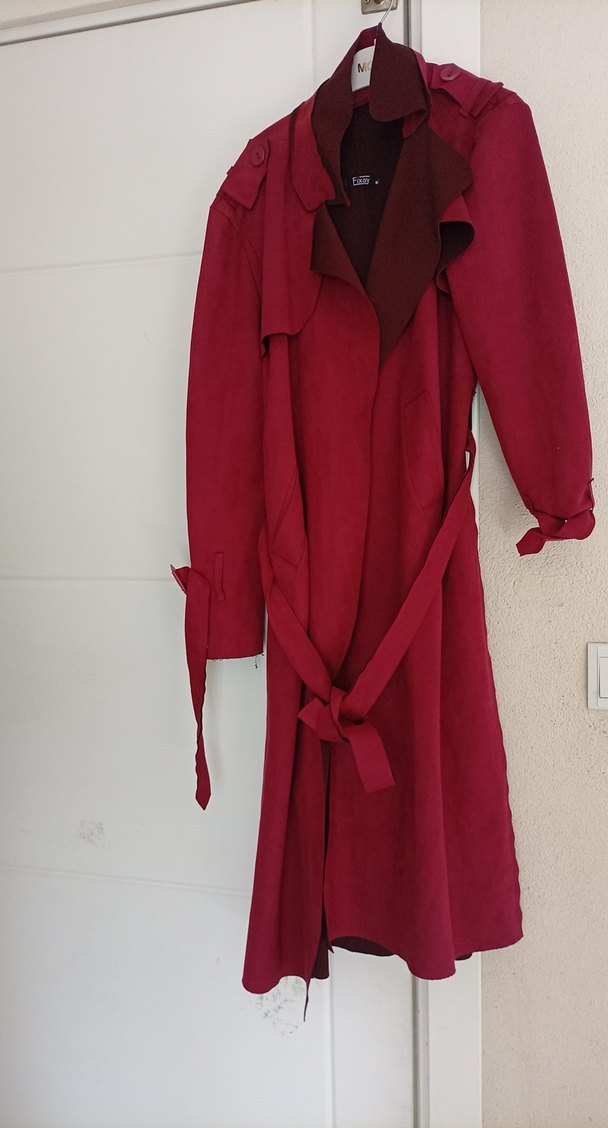 Bordo renkli uzun kesim trençkot, salaş kesimi ve yakasında drapeli detaylar bulunur. Yumuşak ve sıcak kumaştan üretilmiştir, günlük kullanıma uygundur.