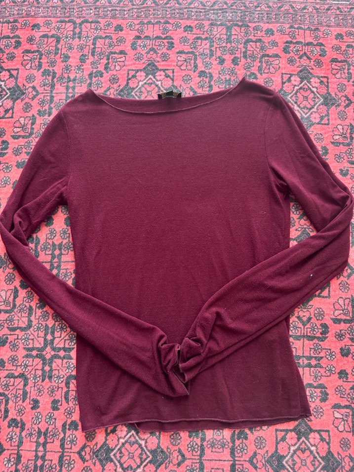 Bordo renk, uzun kollu ve bisiklet yaka, yumuşak dokulu kumaştan üretilmiş, günlük kullanıma uygun, sade ve şık kadın kazak.