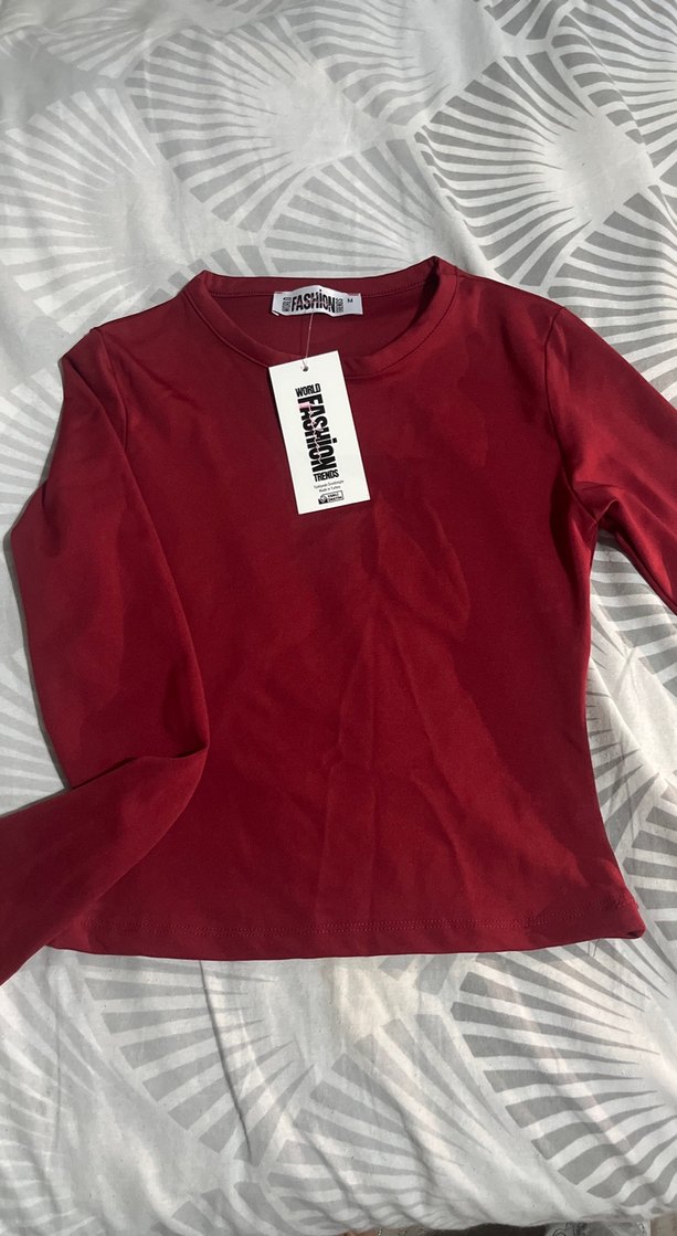 Düz bordo renk, uzun kollu, yuvarlak yaka, sentetik kumaştan yapılmış, günlük kullanıma uygun, vücuda oturan kadın tişörtü.