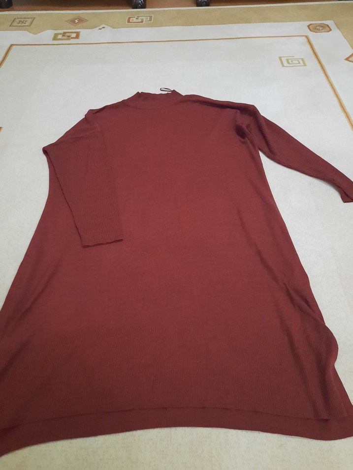 Bordo renkli, uzun kollu, bisiklet yaka, midi uzunlukta, bol kesim kadın triko. Yumuşak sentetik kumaştan, sade ve minimalist tasarım, günlük kullanıma uygun.