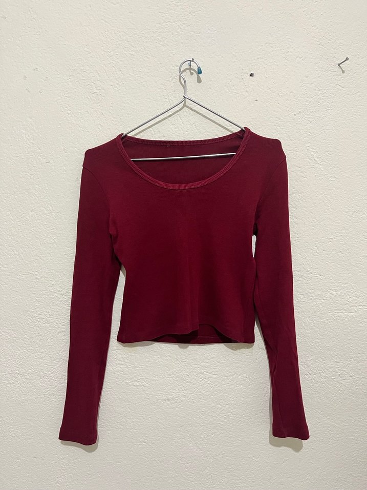 Bordo renkli, uzun kollu ve yuvarlak yaka olan bu crop top, pamuklu kumaştan üretilmiştir. Günlük kullanıma uygun, sade ve şık bir tasarımdır.