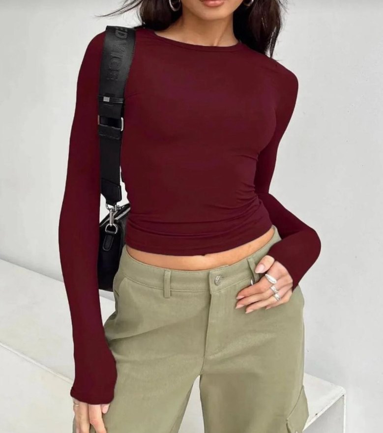 Bordo renkli, dar kesim ve yuvarlak yakalı kadın bluz, uzun kollu ve rahat sentetik kumaştan üretilmiştir. Günlük kullanıma uygun sokak stili şıklığı sunar.