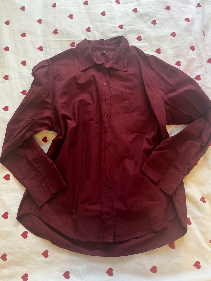 Bordo pamuklu gömlek, uzun kollu ve notched lapel yakaya sahiptir. Düğmeli ve bol kesim olan bu gömlek, romantik buluşmalar için uygundur. ❤️