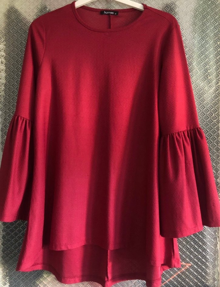 BİLGİLER SON RESİMDE MEVCUTBordo renkli, uzun kollu ve fırfırlı detaylı kadın tunik. Sentetik kumaştan, salaş kesim ve midi boyda, bohem tarzına uygun.