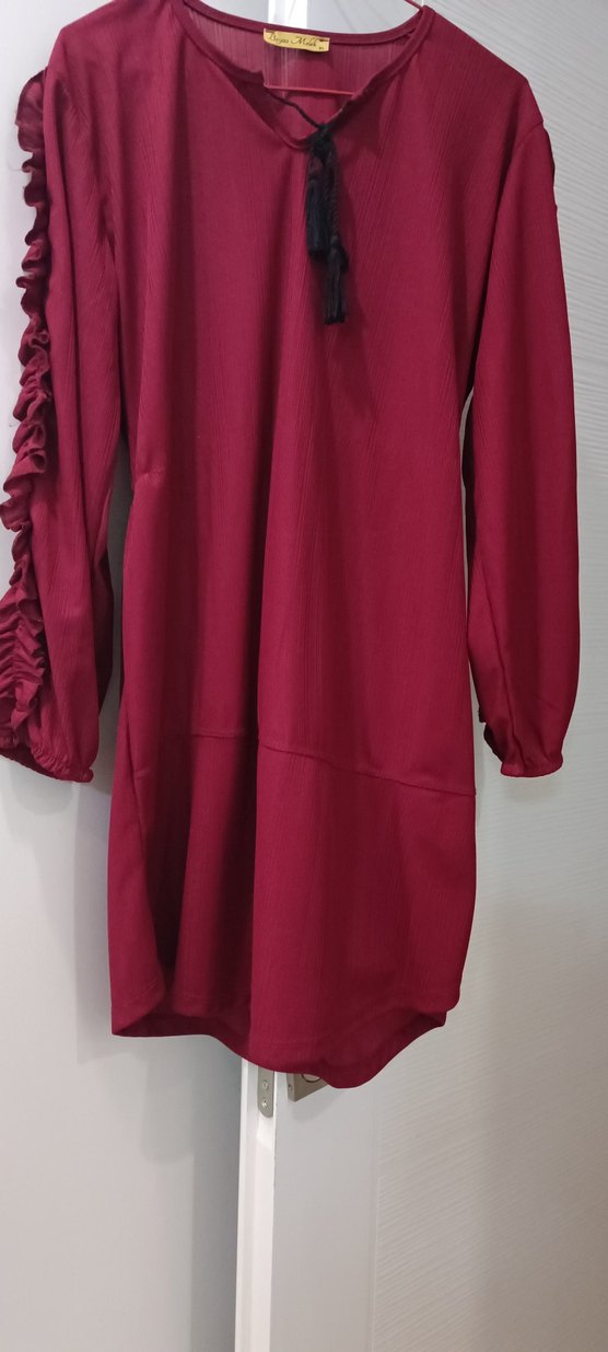 Bordo uzun kollu, yüksek yakalı ve nakış detaylı tunik. Yumuşak sentetik kumaştan, bol kesim, günlük rahat sokak stili için uygun. sorunsuz yeni gibi