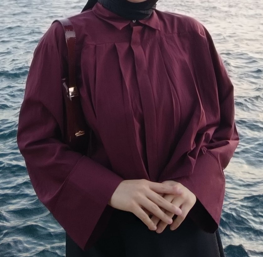 Bordo renginde, uzun kollu ve salaş kesim gömlek. Minimalist ve desen içermeyen normcore tarzda bir modeldir.