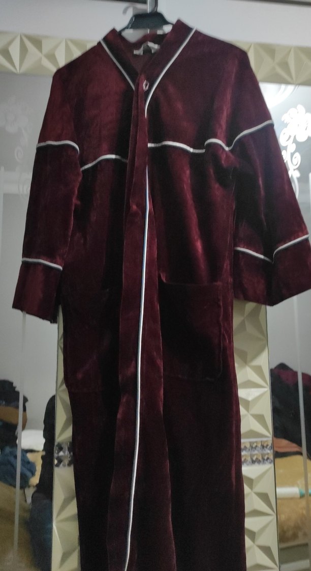 Parlak bordo renkli, uzun kollu ve bol kesim kadife sabahlık. Konvansiyonel tarzda, ince şerit detaylı ve yumuşak dokulu, rahat bir ürün. ️