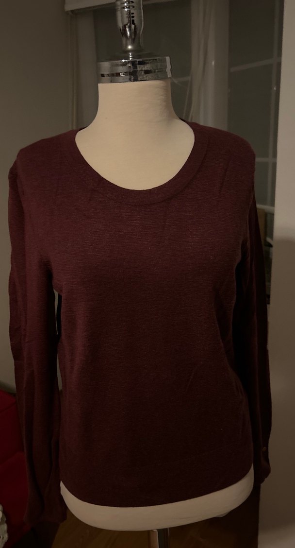 Bordo renkli, kadın kazak. Yuvarlak yaka ve uzun kollu, rahat kesimiyle günlük kullanıma uygun, çağdaş ve rahat bir tarz sunar.