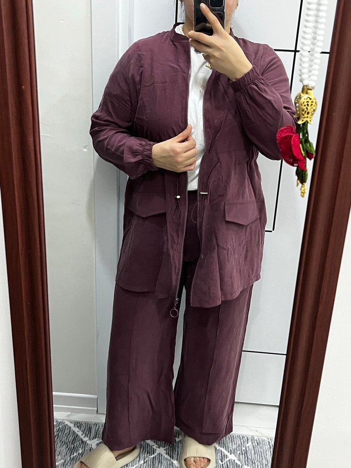 Bordo renkli, uzun kollu ve kuşaklı kadın takım. İpek dokulu kumaştan, regular fit kesim ve etek yaka detaylı. Günlük ve şık kullanım için uygun.