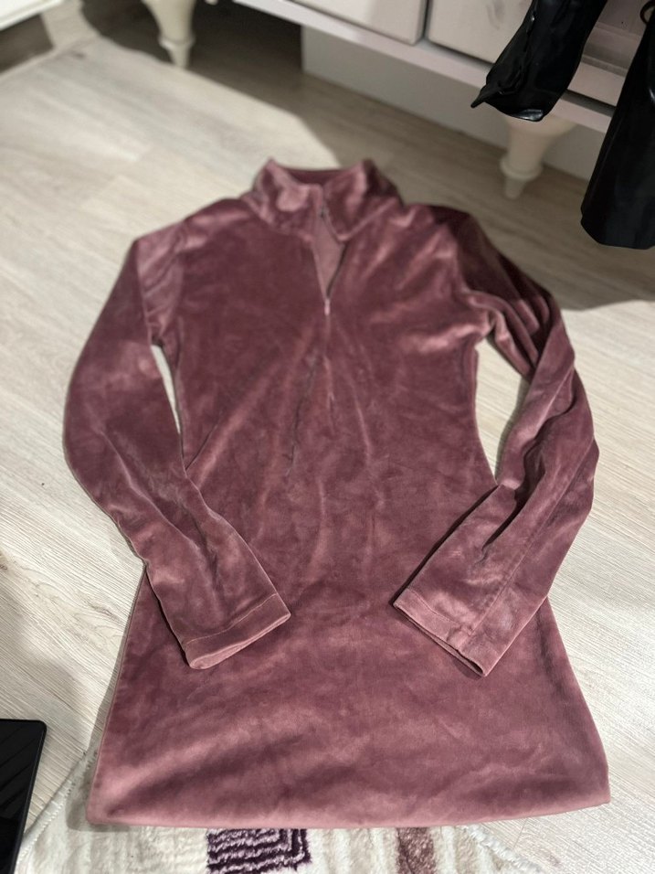 Bordo renkli, uzun kollu ve midi boyda, kadife dokulu, rahat kesim kadın elbise. Yarım fermuar yakası ve sade deseniyle konforlu sokak stiline uygun.