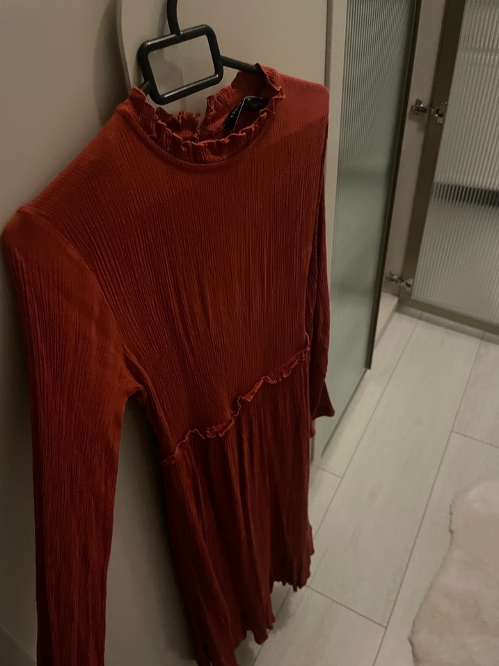 Bordo renkli, yüksek yakalı ve uzun kollu pilili örme elbise. Yumuşak keten kumaştan, rahat kesim ve midi boyda, günlük kullanıma uygun.