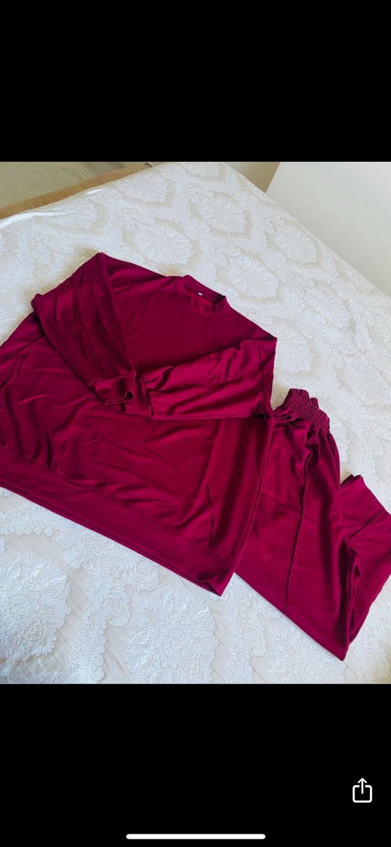 Bordo renkte, uzun kollu ve salaş kesim kadın eşofman takımı. İpek gibi dokusuyla sade ve şık, günlük kullanıma uygun bir modeldir. ♀️