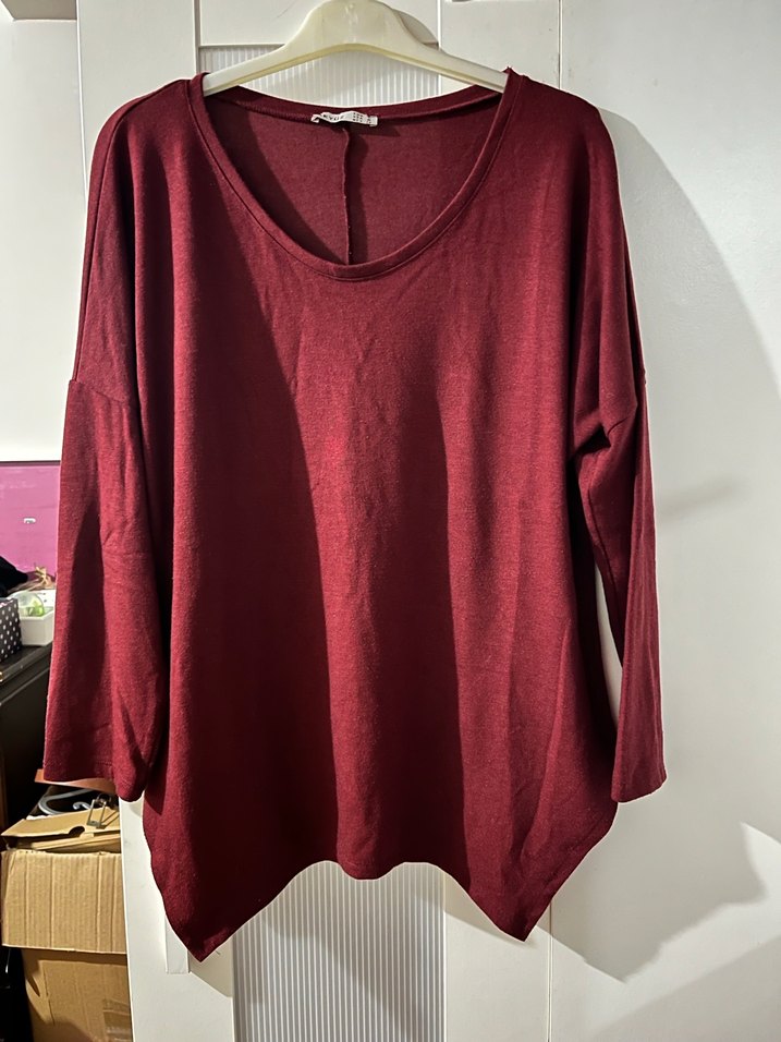 Bordo renkli, uzun kollu ve salaş, günlük ve şık ürünler.