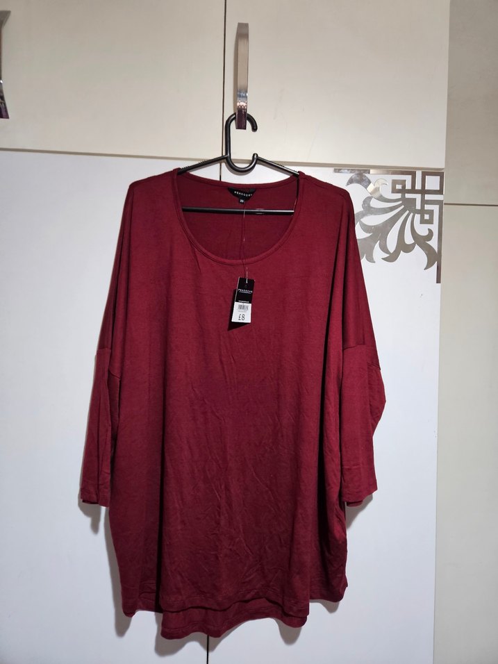 Bordo renkli, uzun kollu, salaş kesim ve yuvarlak yakalı. Günlük kullanıma uygun rahat ve şık bir stil sunar.