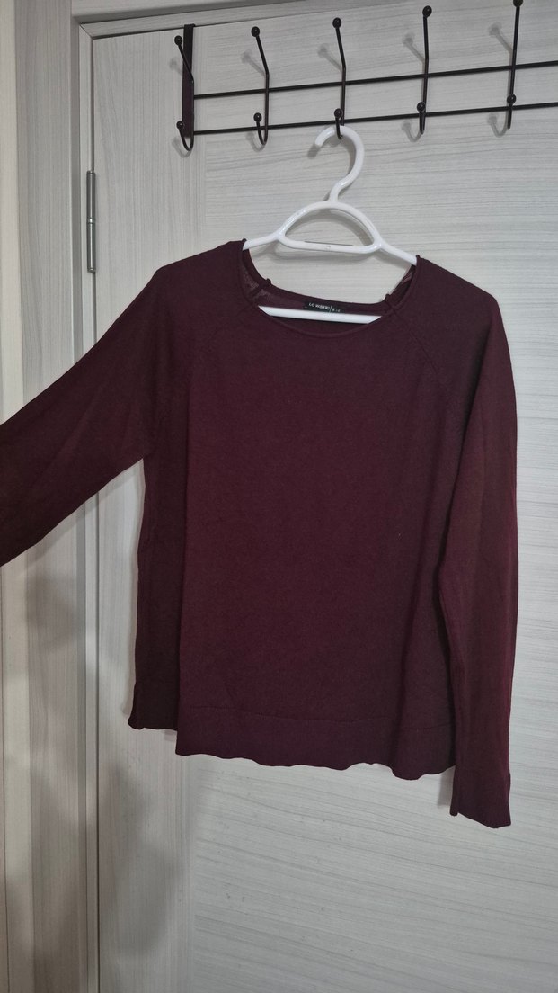 Bordo, uzun kollu ve yuvarlak yakalı, rahat kesimli kadın triko. Günlük kullanıma uygun sade ve şık tasarım.