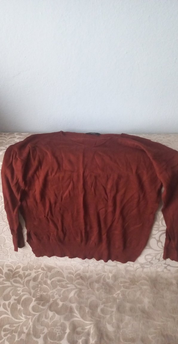 Bordo renkli kadın kazak, uzun kollu ve yuvarlak yakalıdır. Keten dokuma, bol kesim ve sade tasarımıyla günlük kullanıma uygundur. Orta boy midi uzunluğundadır.