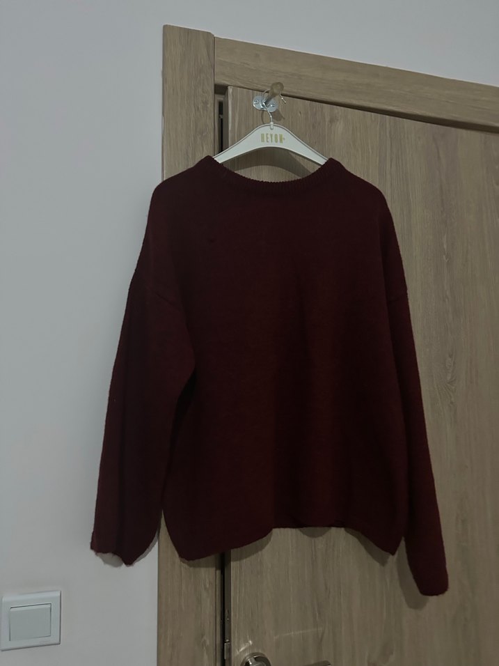 Bordo renkli, yuvarlak yakalı ve uzun kollu, rahat kesim normal uzunlukta örme kazak. Günlük kullanım için uygundur.