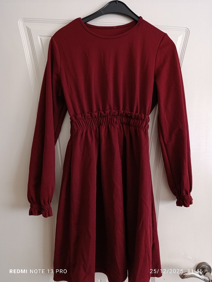 Bordo renkli kadın tunik , uzun kollu ve salaş kesimlidir. Bel kısmı büzgülü, yumuşak sentetik kumaştan, bisiklet yaka ve sade sokak stili. 36,38 beden için uygundur