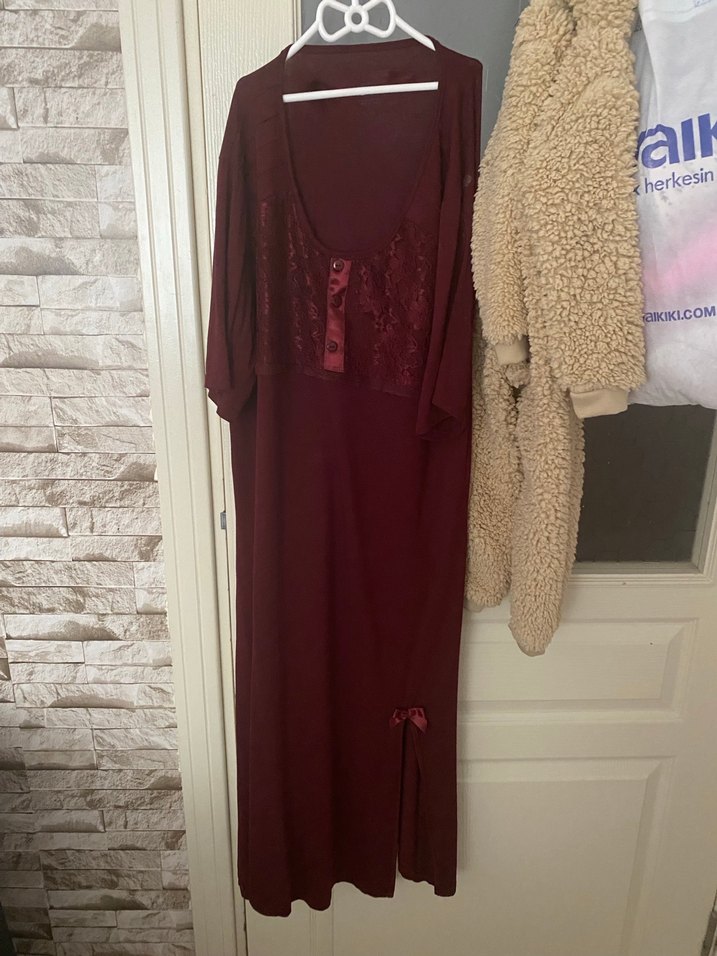 Bordo renkte, uzun kollu ve uzun boylu, vücuda oturan kadın bornoz. Düz ve düğme detaylı tasarıma sahip. Doğum çantası için aldım 1 kez bile giymedim miss dünya markası