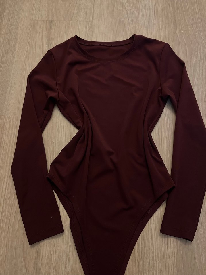 Bordo renkte, uzun kollu ve yuvarlak yaka, vücuda oturan kadın zıbın. Düz ve desensiz, sentetik esnek kumaştan, minimal sokak stili için uygun. M l bedenler için uygundur