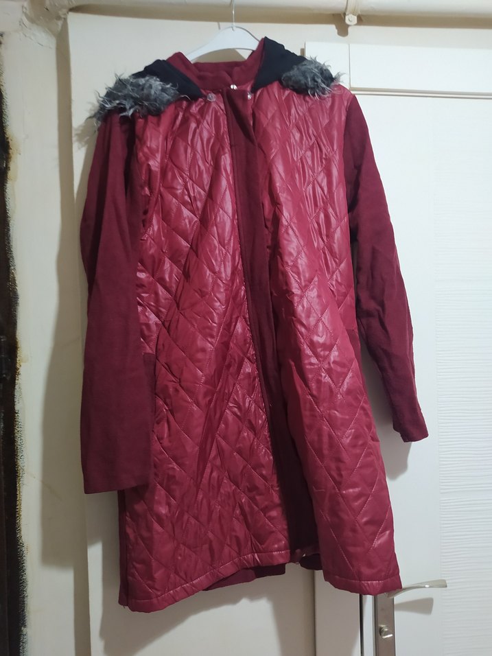 Bordo renkli, uzun kesim ve kürklü kapüşon detaylı kadın ceketi. Dar kesim, notched lapel yakalı ve uzun kolludur. Günlük kullanıma uygundur.