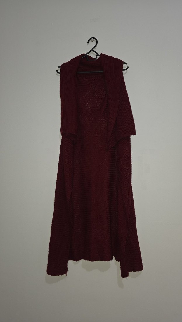 Bordo renkli, yüksek yaka ve kolsuz örme elbise. Salaş kesim ve uzun boy, rahat ve şık bir görünüm sunar. standart gibi .bişey