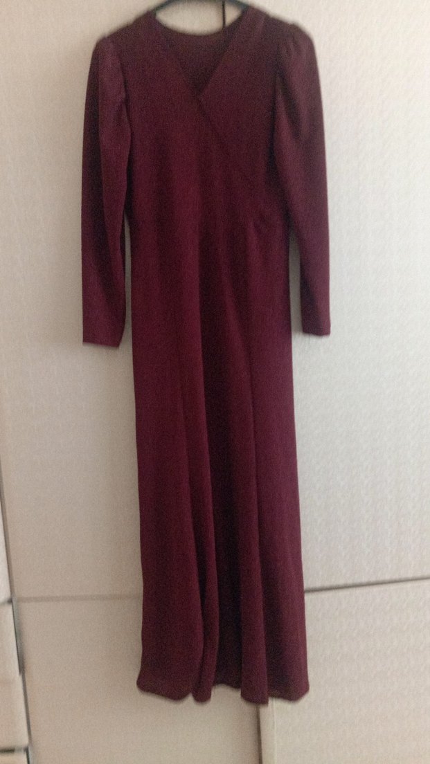 Bordo renkli, uzun kollu ve v yaka, drapeli, ince oturan, yumuşak ve sıcak kumaştan uzun elbise. Ofis için uygun, minimalist ve şık tarzda.