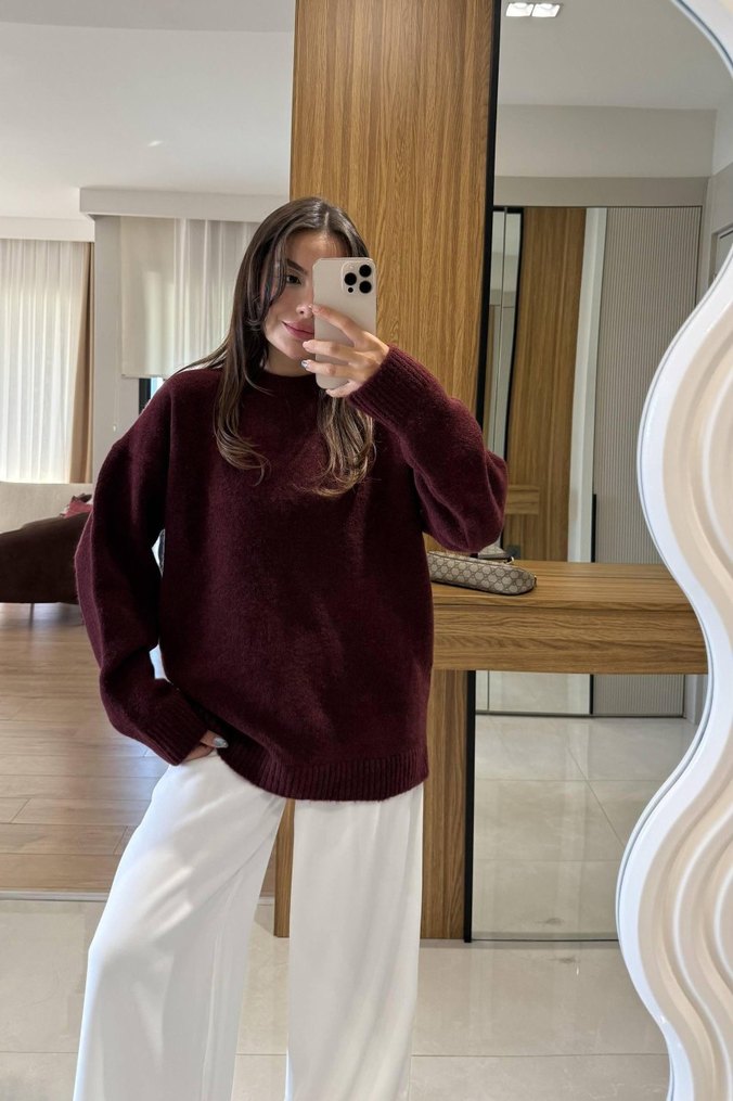 Bordo renkli, yumuşak yünden örülmüş kadın kazak. Salaş kesim, uzun kollu ve yuvarlak yaka ile günlük kullanıma uygundur.