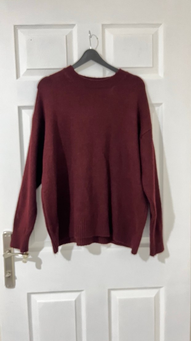 Bordo renk, yuvarlak yaka ve uzun kollu, yün örgü salaş kadın kazak. Rahat ve sade tasarımlı, günlük kullanım için uygun midi boyda kazak.