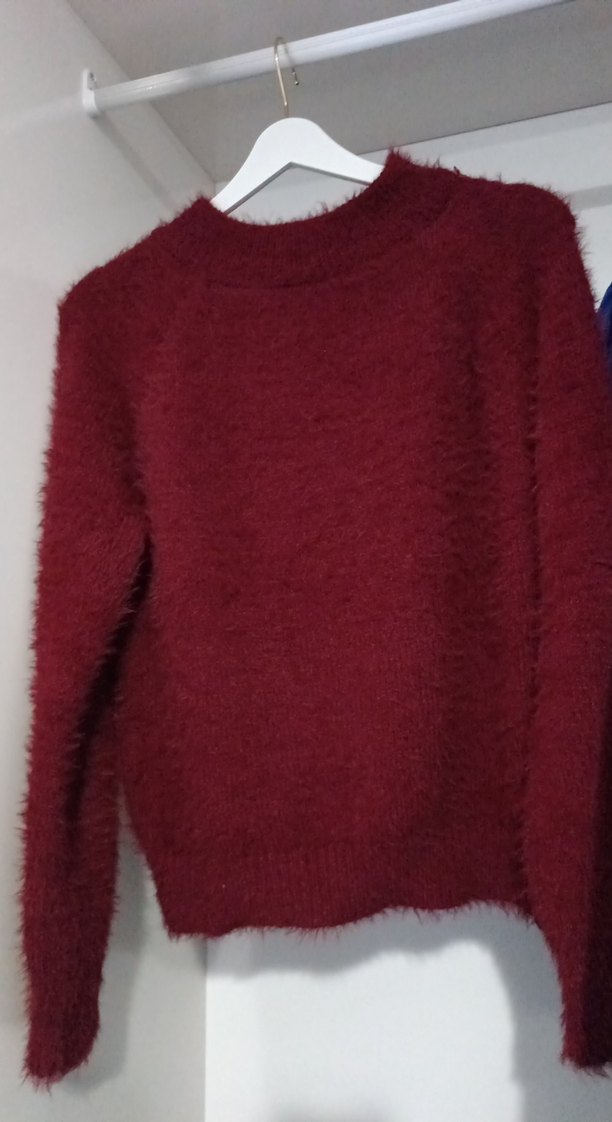 Bordo renkli, yuvarlak yaka ve uzun kollu kadın yünlü örgü kazak, rahat kesim ve normal boyda, günlük kullanıma uygundur.