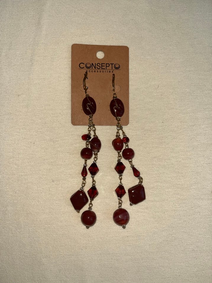 Bordo renkte, boncuk detaylı ve baskılı desene sahip uzun bohem küpeler. Romantik gece için uygun, Consepto markalı.