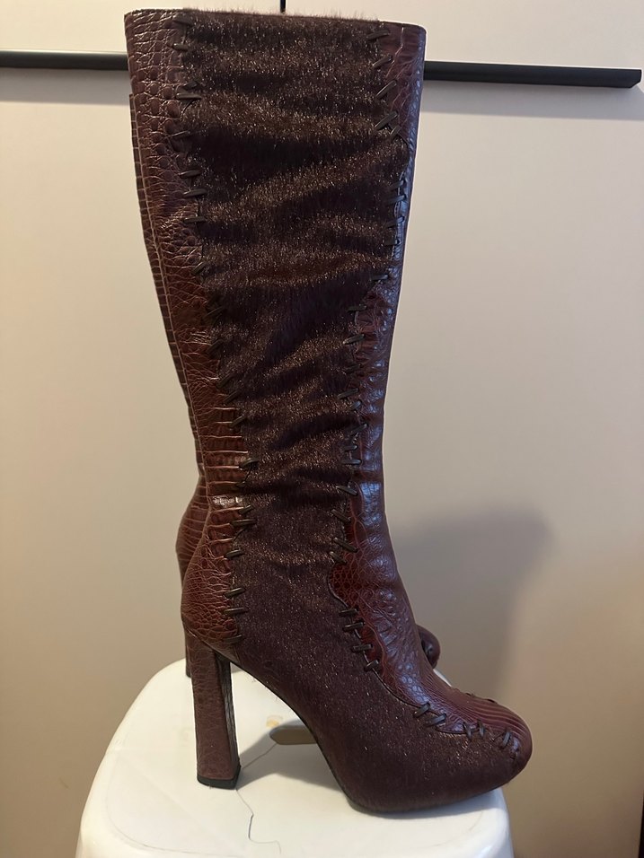 Kahverengi deri, yılan desenli diz boyu topuklu çizme. Kürk detaylı ve sivri topuklu, ofis için cesur ve şık bir tasarım.