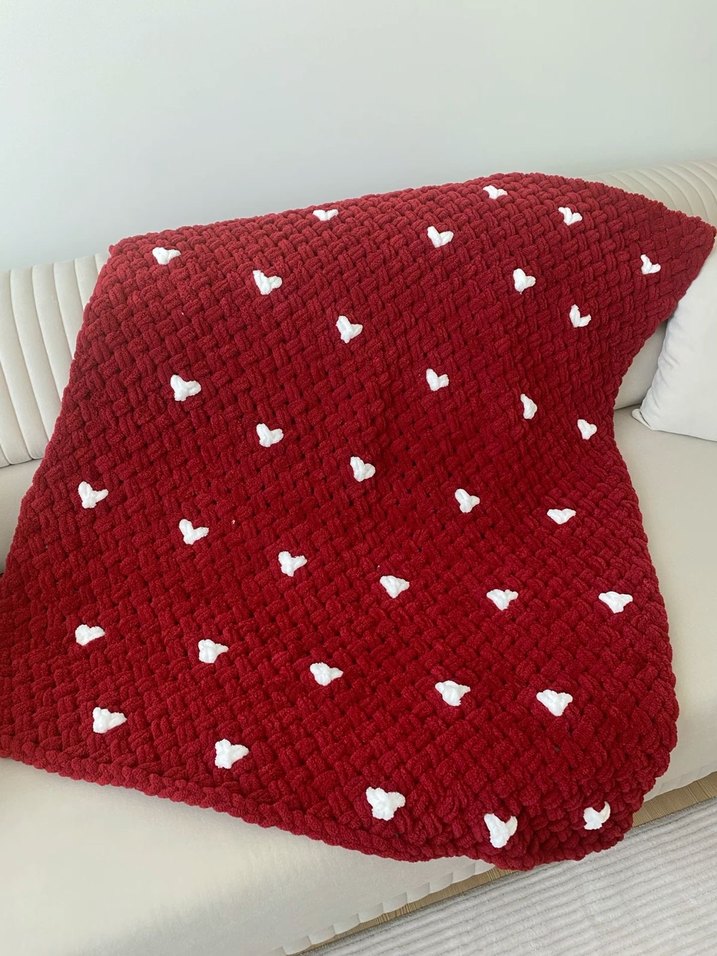 Bordo renkte, küçük beyaz kalp detaylı örgü battaniye, yumuşak ve sıcak tutan dokusuyla dikkat çekiyor. ❤️130x110
