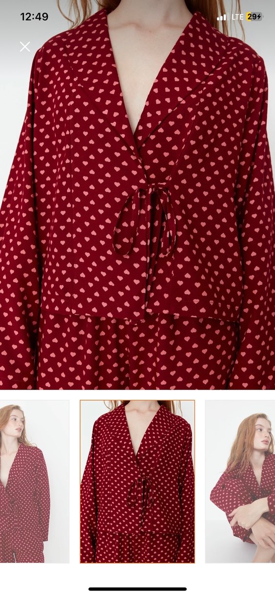 Bordo renkte, bohem tarzda, küçük kalp desenli, uzun kollu ve bol kesim pijama. Önde bağlama detayı bulunan uzun boy rahat bir modeldir. ❤️