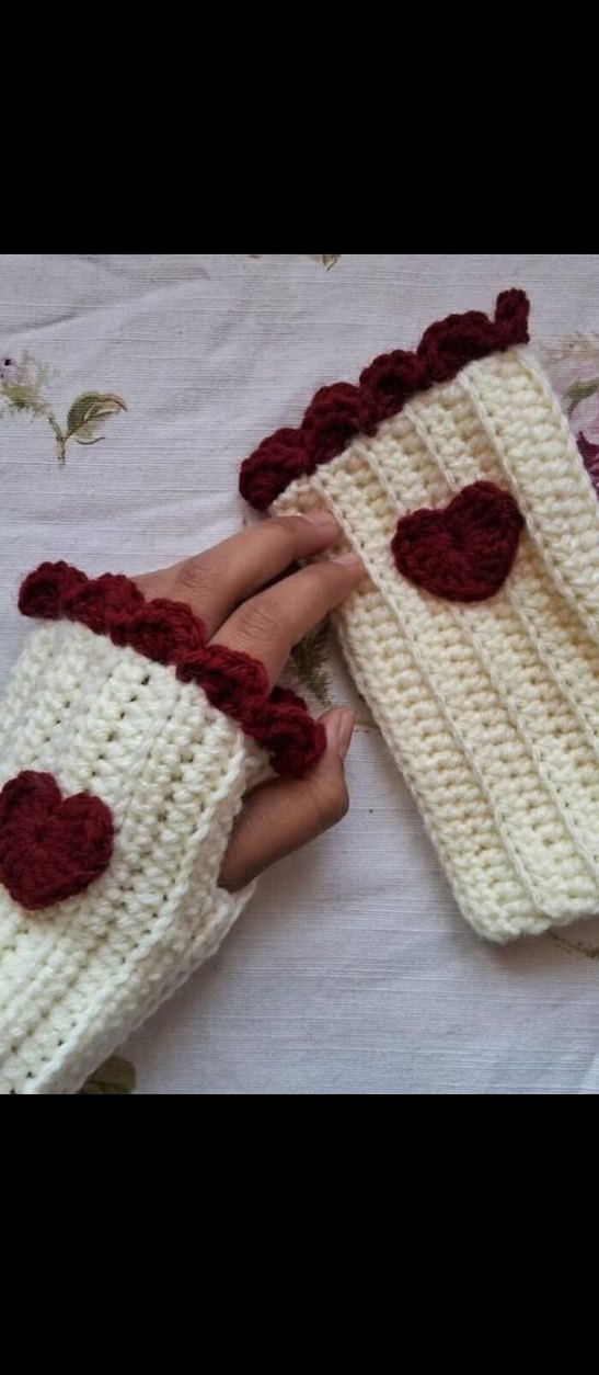 Beyaz örgü eldivenler, bordo kalp ve kenar detaylarıyla bohem ve renkli bir tarz sunar.