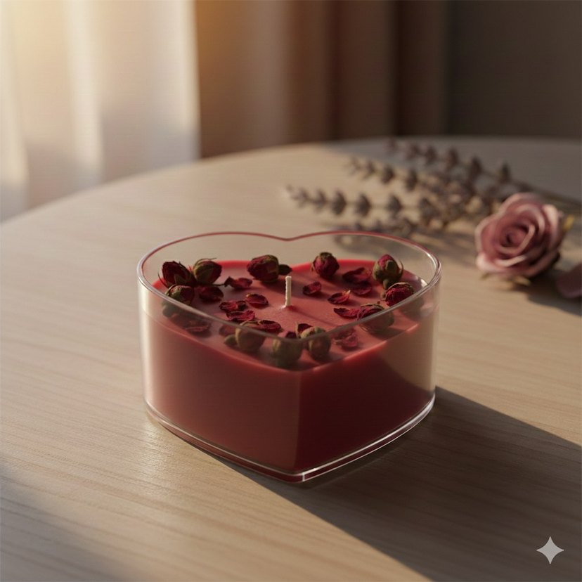 Küçük kurutulmuş güllü, bordonun koyu tonunda kalp şeklinde dekoratif mum. Şeffaf kapta, ortamınıza sıcak ve romantik bir hava katar. ️