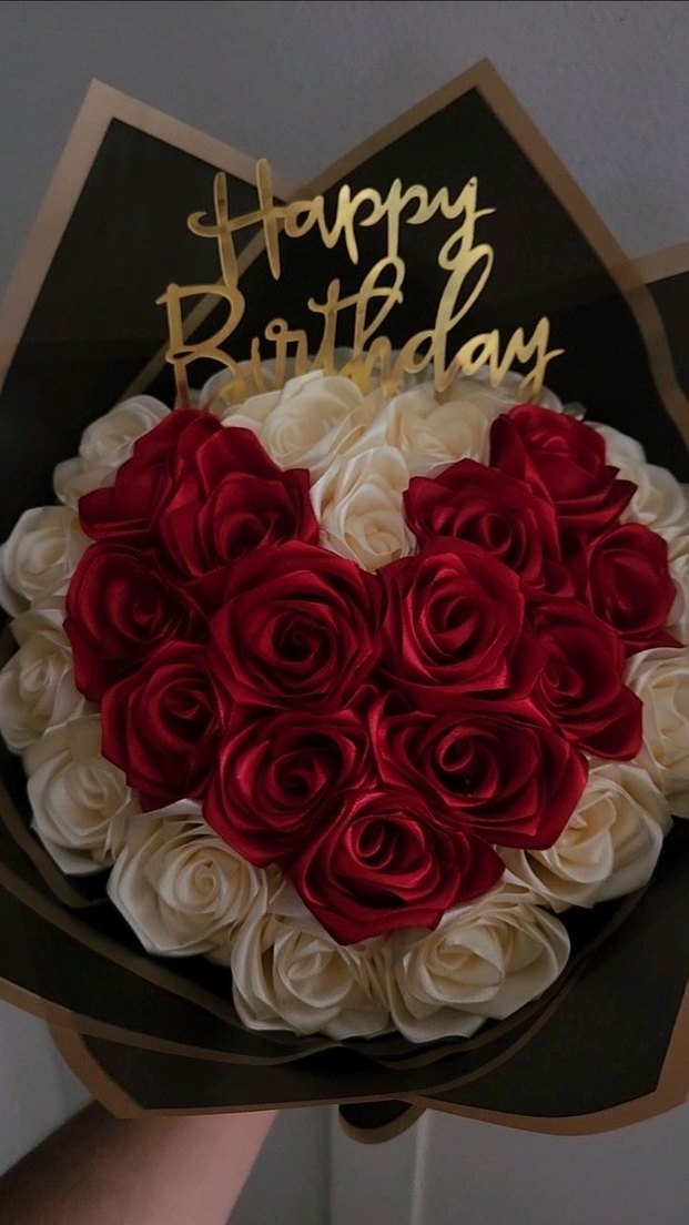Bordo ve beyaz güller kalp şeklinde düzenlenmiş, üzerinde altın renkli 'Happy Birthday' süsü bulunan renkli buket.