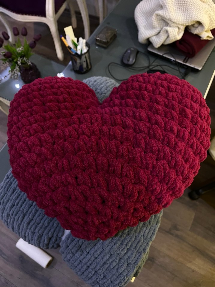Kalp şeklinde, kalın örgü dokulu bordo yastık. boyut ve renk için lütfen ilanı almadan önce ulaşınız.BÜYÜK BOY.(standart boy: 479₺)
