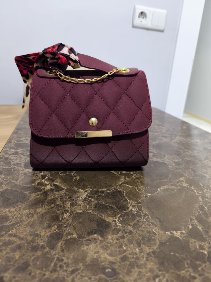 Bordo kapitone desenli, altın tokalı kadın çanta. Zincir askısında fular detaylı, sentetik kumaştan ve hafif yılan derisi dokusuna sahip. Modern klasik tarz için uygun.