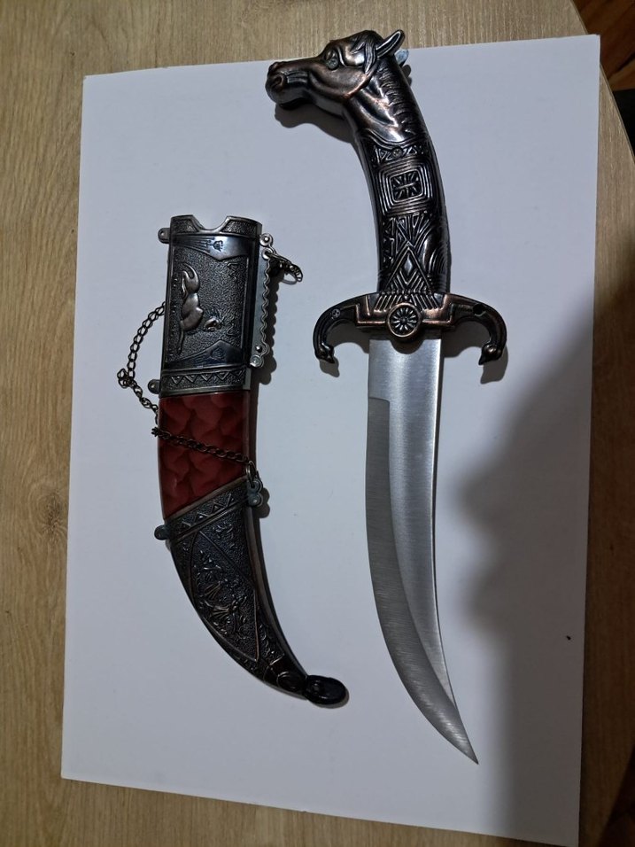 Kıvrık bıçak, at başı şeklinde işlemeli sap ve detaylı desenli bordo kaplamalı kın ile birlikte gelir. ️