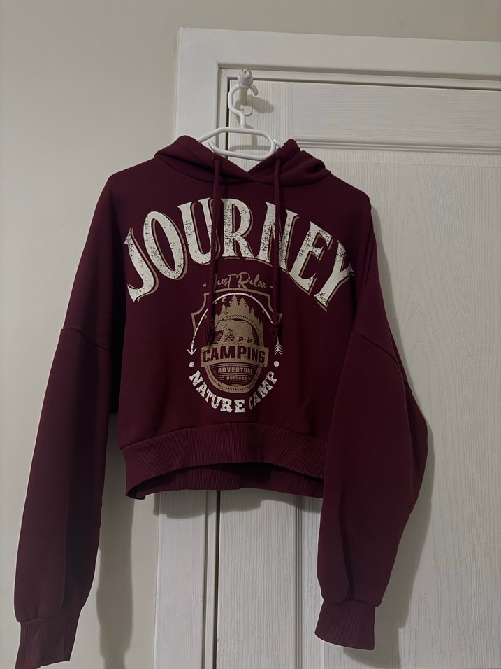 Bordo kapüşonlu sweatshirt, uzun kollu ve bol kesimdir. "JOURNEY" baskılı, yumuşak ve sıcak kumaştan yapılmıştır. Günlük spor giyim için uygundur.