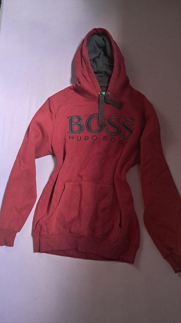 Bordo renk, kapüşonlu ve uzun kollu BOSS sweatshirt. Rahat kesim ve renkli desenli, yumuşak kumaştan üretilmiştir. Ürün orijinal değildir