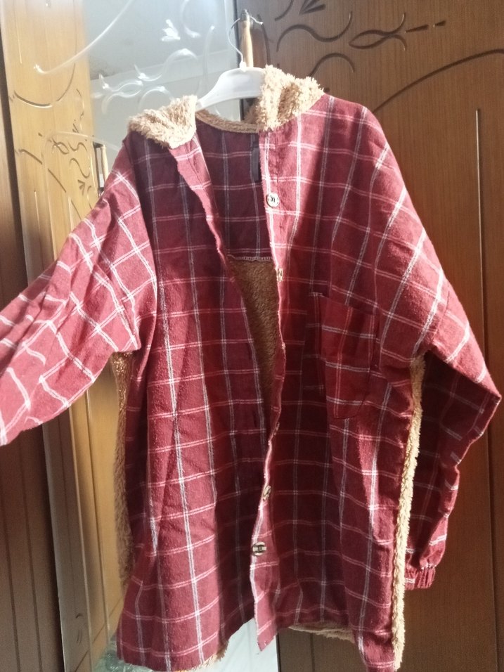 Bordo renkli, uzun kollu, kapüşonlu ve düğmeli, içi yumuşak kumaşla kaplı bol kesim gömlek. Rahat günlük kullanıma uygun. 40 42 beden olur