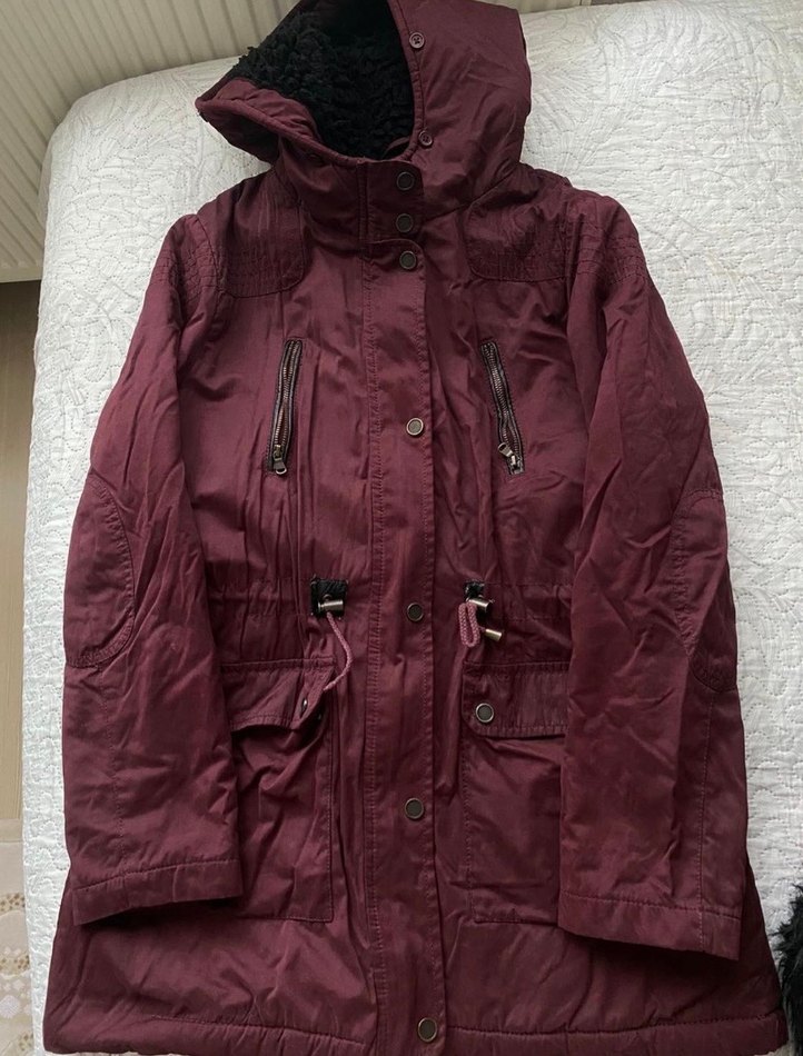 Bordo renkli, düğmeli, kapüşonlu kadın ceket. Rahat kesim, uzun kollu ve yumuşak dokulu kumaştan yapılmıştır. Günlük kullanıma uygundur.