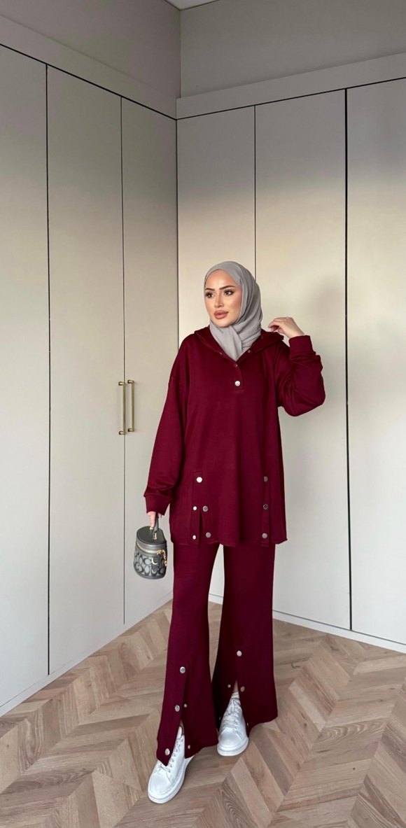 Bordo renginde, kapüşonlu ve düğmeli, bol kesim kadın takımı. Yumuşak ve rahat kumaşıyla günlük kullanıma uygundur.