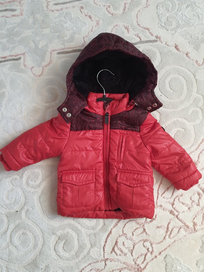Erkek çocuk montu, kapüşonlu ve kürklü detaylarla, yumuşak ve sıcak kumaştan, koyu bordo renkte ve hafif batik desenlidir.