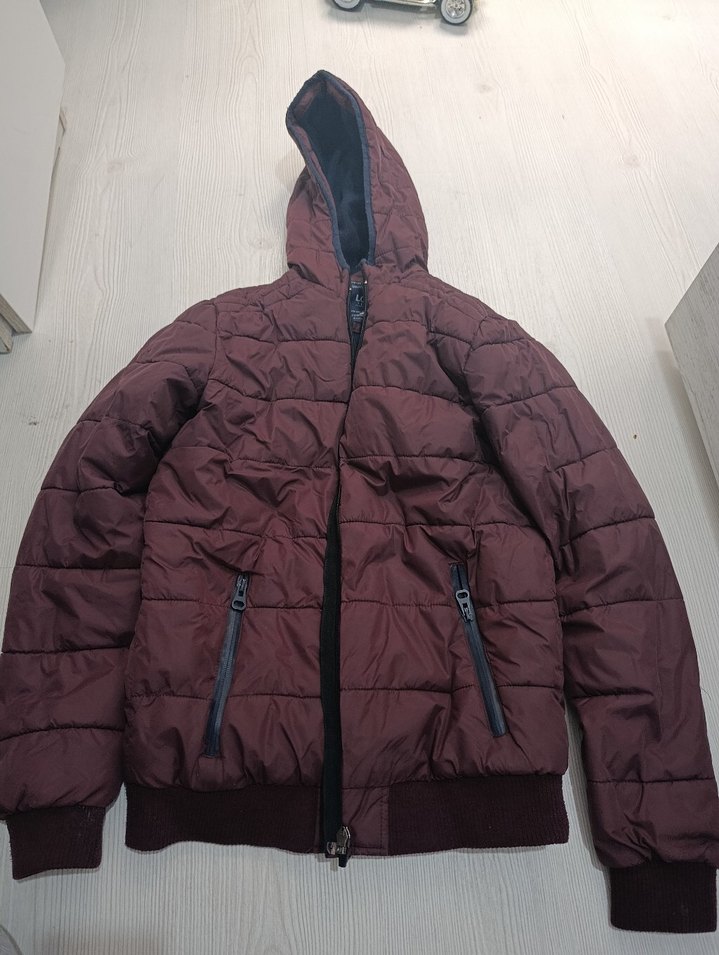 bordo kapüşonlu ve fermuarlı mont. Yüksek yakalı, uzun kollu 3. görsel yırtık gibi görünüyor ama kesimini o şekilde bırakmışlar fermuar aç kapa yapmaya mani bi durum yok
