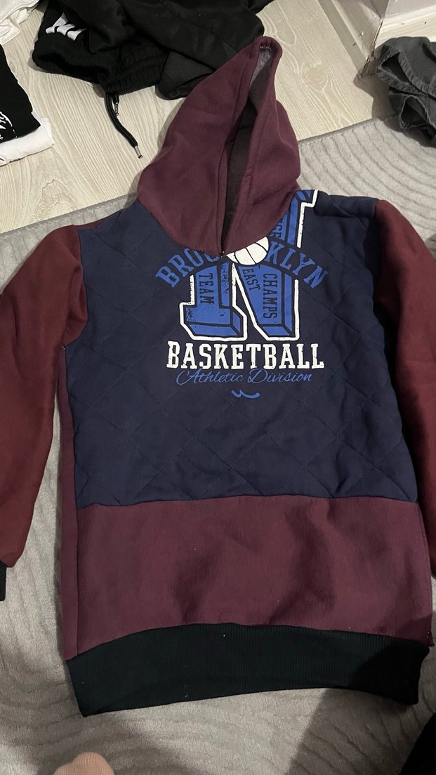 Kapüşonlu, uzun kollu erkek çocuk sweatshirt. Yumuşak ve sıcak kumaştan, fermuarlı ve baskılı basketbol temalı desenli, koyu bordo ve lacivert renklerde.