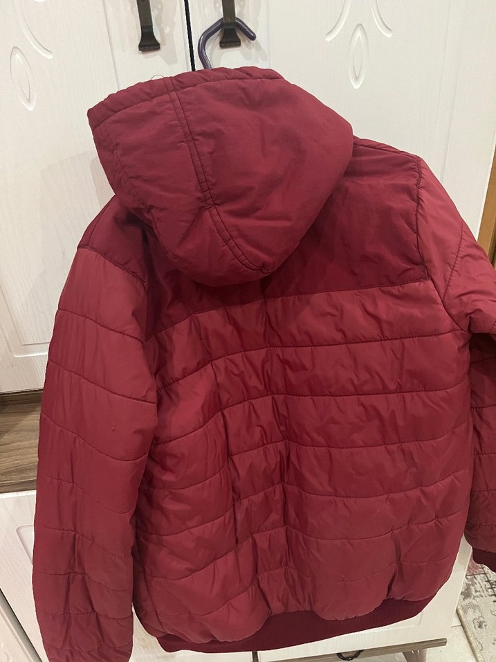 Bordo renkli erkek kışlık mont, kapüşonlu ve fermuarlı. Sentetik kumaştan, yüksek yaka ve uzun kollu, midi boyda, günlük kullanıma uygun sıcak tutar. ❄️