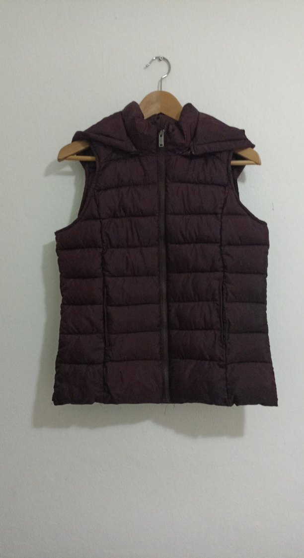 Bordo renkli, kapüşonlu ve fermuarlı, yüksek yakalı, kolsuz çocuk yelek. Rahat ve şık, günlük kullanıma uygun midi boyda, dar kesim bir modeldir.